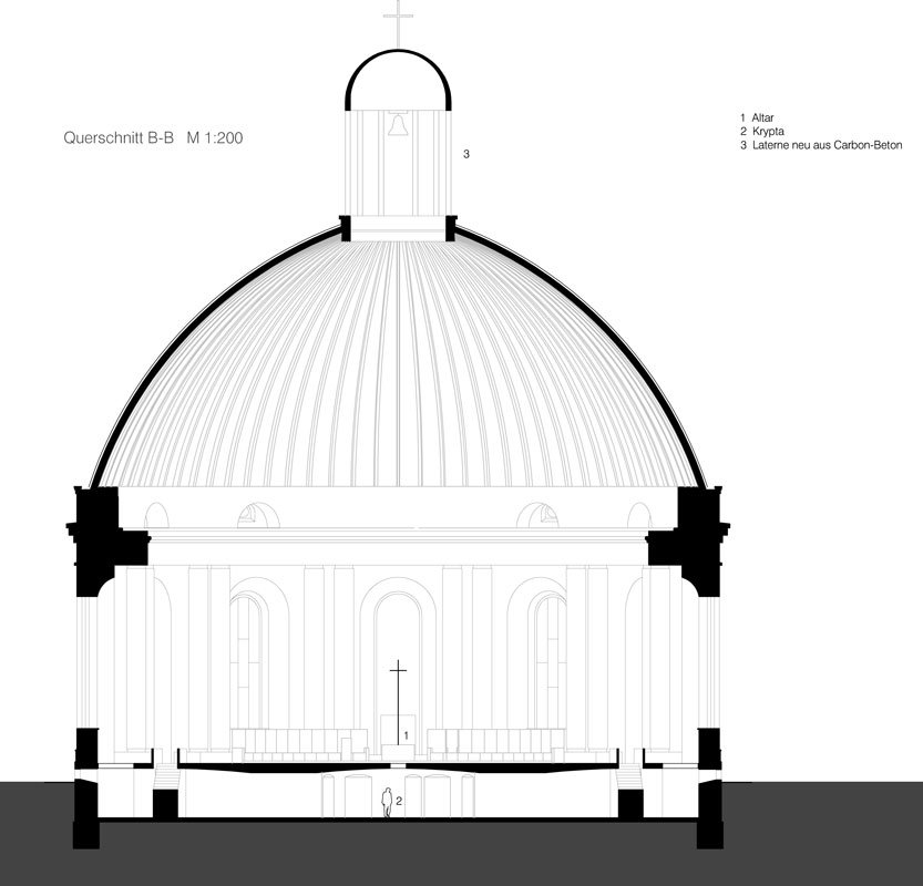 Dieser Erkenntnis folgt unser Entwurf: Die St. Hedwigs-Kathedrale benötigt eine durchgreifende Neugestaltung des Innenraums, die wir auch im Erläuterungsbericht nicht denkmalpflegerisch verbrämen wollen. Eine Vereinbarkeit der Belange der Denkmalpflege mit den Anforderungen der Nutzung ist hier nicht gegeben – jedenfalls was den Innenraum betrifft. Die Gebäudehülle einschließlich der wieder errichteten Kuppel kann und muss selbstverständlich erhalten werden, allerdings ergänzt um eine für die städtebauliche Wirkung und die Gebäudekubatur bereichernde Wiedererschaffung der Laterne.