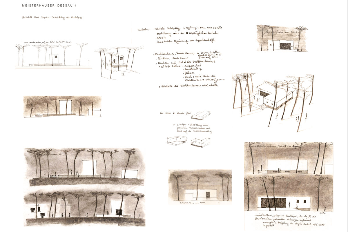 Kern der Wettbewerbsaufgabe ist die Frage des Umgangs mit den beiden Fehlstellen im Meisterhausensemble, der Haushälfte Moholy-Nagy und des Hauses Gropius. In der Abwägung zwischen Rekonstruktion, Belassen der Fehlstelle oder Neubau sind wir zur Überzeugung gelangt, dass für beide Gebäude unterschiedliche Lösungen angemessen sind. Hierbei spielen denkmalpflegerische Gesichtspunkte ebenso eine Rolle wie nutzungstechnische Anforderungen.